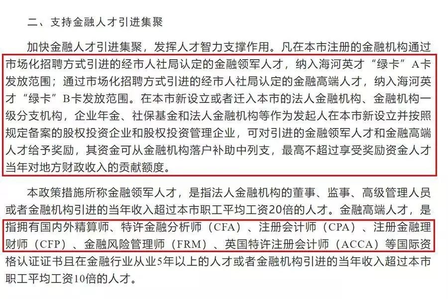 在天津市《關(guān)于支持金融機(jī)構(gòu)和金融人才在津發(fā)展的政策措施》第二項(xiàng)“支持金融人才引進(jìn)集聚”中,更是明確了對(duì)金融高端人才的引進(jìn)與獎(jiǎng)勵(lì)。同學(xué)們可以好好看下: