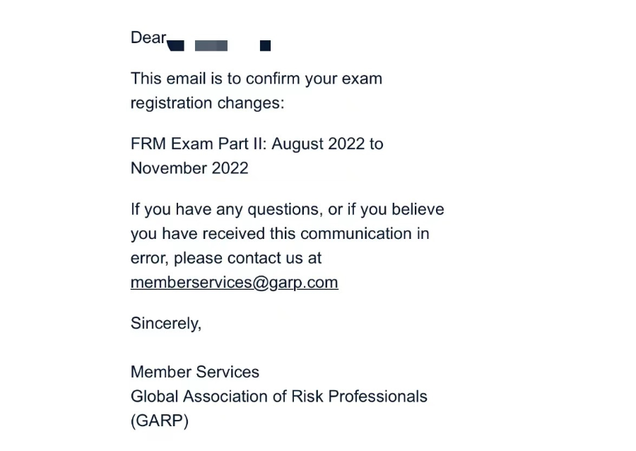 整體郵件內(nèi)容很簡短,就是告知這位二級考生,他的考期從8月確認被延期至11月,小伙伴登錄協(xié)會后臺看到dashboard也已經(jīng)完成了相應(yīng)的更改。》》點擊了解2022年FRM一二級考試考期安排
