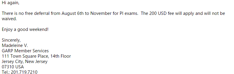 這里一定要劃大重點,一級考生是不能免費延期的,之前有小伙伴特別去咨詢,協(xié)會給到的回復(fù)是,PART 1(一級考生)不可以免費延期至11月,需要花200美金申請延期。(協(xié)會郵件回復(fù)截圖可看下圖)