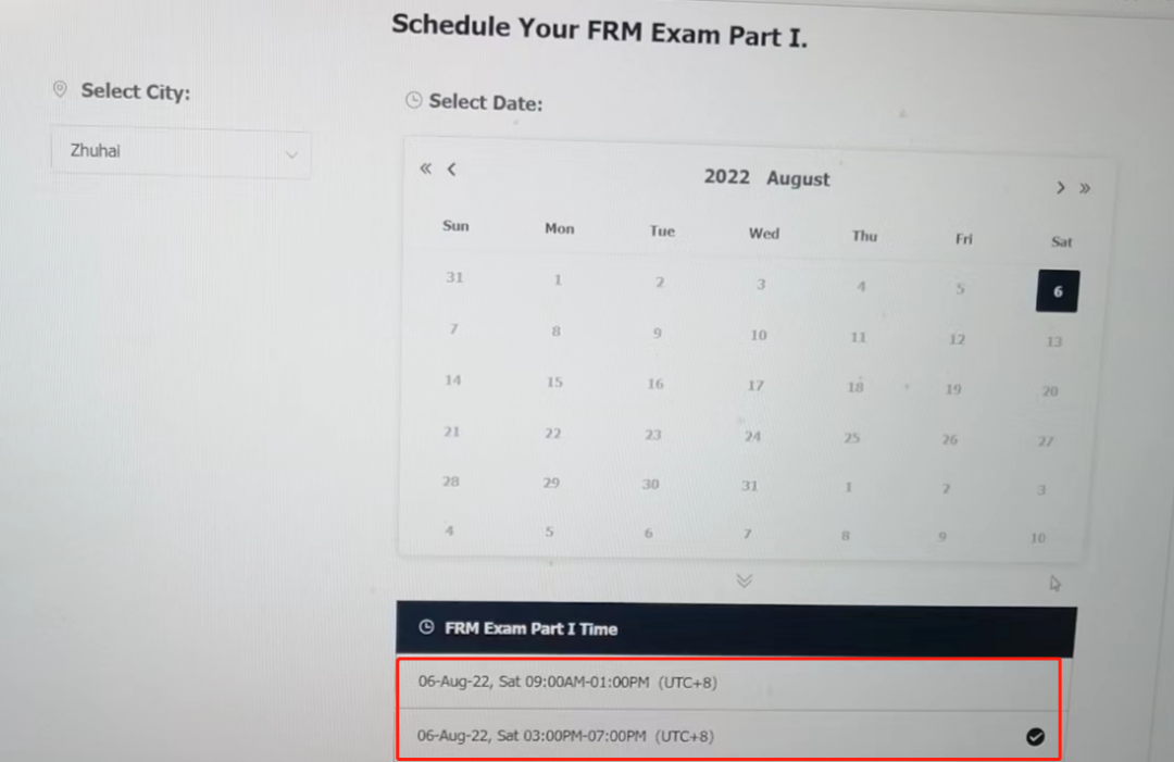 FRM 一級(jí)考位預(yù)約:8月6日(兩個(gè)時(shí)間段可選)分別是上午9:00-13:00和下午3:00-7:00,如下圖: