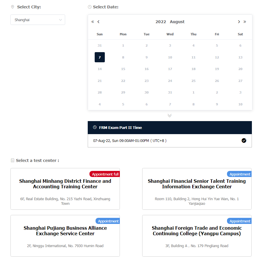 FRM 二級(jí)考位預(yù)約:8月7日(僅一個(gè)時(shí)間段),上午9:00-13:00