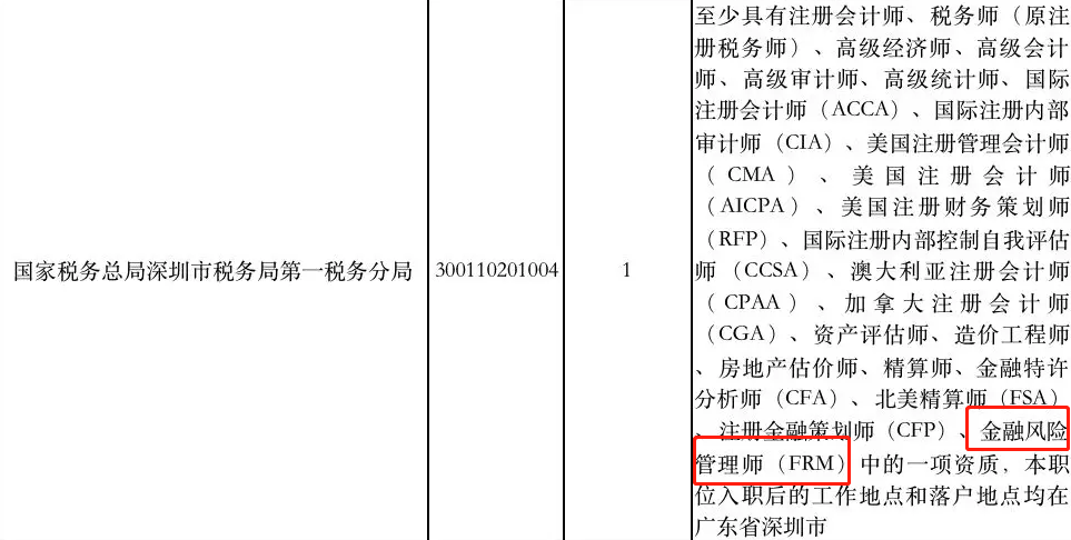 其中,稅務(wù)系統(tǒng)招錄人數(shù)最多,接近1.5萬人,占總招錄人數(shù)的58%。由此可見,金融類財(cái)經(jīng)類專業(yè)的比起其他專業(yè)的考生,能更容易找到合適的崗位。雖然招錄比例和去年相比大大提升,但競爭比例仍舊非常嚇人。而隨后發(fā)布的《國家稅務(wù)總局深圳市稅務(wù)局補(bǔ)充錄用職位簡表》中,不少崗位明確要求需要拿到FRM證書。
