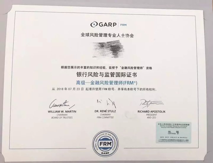 如果需要中文版證書可以申請,國家勞動部可以頒發(fā)中文版的FRM證書,也就是你可以擁有兩套FRM證書,但是在中國效用是一樣的。