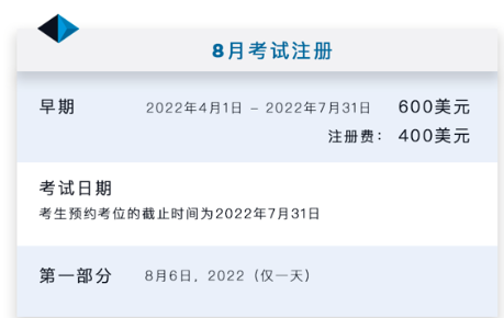 2022年11月FRM考試的報名已于2022年5月1日開始,第一次報名FRM?第一部分考試時,首次注冊FRM考試的考生需支付注冊費400美元。GARP將為每次考試報名提供“早鳥價”和“標(biāo)準(zhǔn)價” 兩個報名階段。更多有關(guān)考試時間、考位預(yù)約截止日期、注冊費用和報名費用的信息,也請參見下方的圖表。