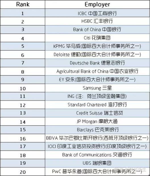 FRM全球前雇主TOP20主要由國際頂級的商業(yè)銀行、投資銀行、四大會(huì)計(jì)師事務(wù)所構(gòu)成。The top 20 companies employing the most Certified FRMs are:
