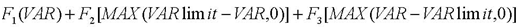 。其中三個F分別是沒有包括在VAR模型中的常數(shù)、未超限的乘數(shù)、超限的乘數(shù)。例如在99%的置信水平上VAR Limit是100,000,F(xiàn)1是2,F(xiàn)2是0.2,F3是4。則當(dāng)VAR是80000時,RAROC charge=2×80000+0.2×(100000-80000)+4×0=164000,則當(dāng)VAR為150000時,RAROC charge=2×150000+0.2×0+4×(150000-100000)=500000。