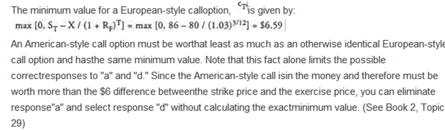 5. What are the minimum values of an American-style and aEuropean-style 3-month call option with a strike price of $80 on anon-dividend-paying stock trading at $86 if the risk-free rate is 3%?