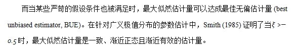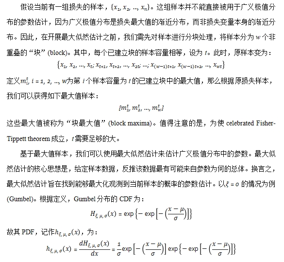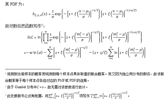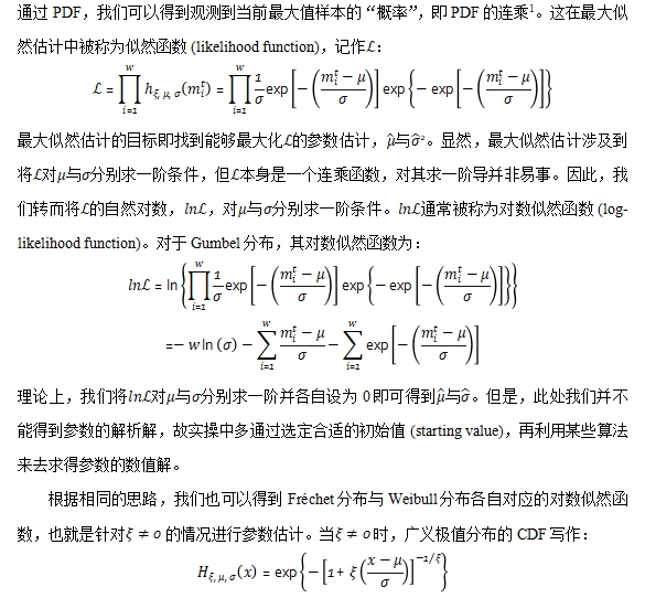 廣義極值分布的參數(shù)估計(jì)方法是多種多樣的,包括最大似然估計(jì)(maximum likelihood)、回歸估計(jì)(regression method)和矩估計(jì)(moment-based method)。下文將來給大家介紹最大似然估計(jì)。