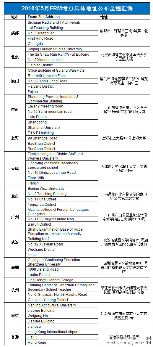 2016年5月考試在即,還不知道考試地點怎么可以呢?根據(jù)FRM協(xié)會公告,2016年5月FRM考點已經(jīng)全部公布了-具體地址公布如下: