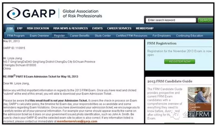 FRM考試準(zhǔn)考證開通時,美國GARP官方將會給每位考生的注冊郵箱內(nèi)發(fā)送一封郵件,告之如何登陸官網(wǎng)下載打印準(zhǔn)考證。如未收到協(xié)會郵件,請點擊以郵件內(nèi)鏈接進行打印: