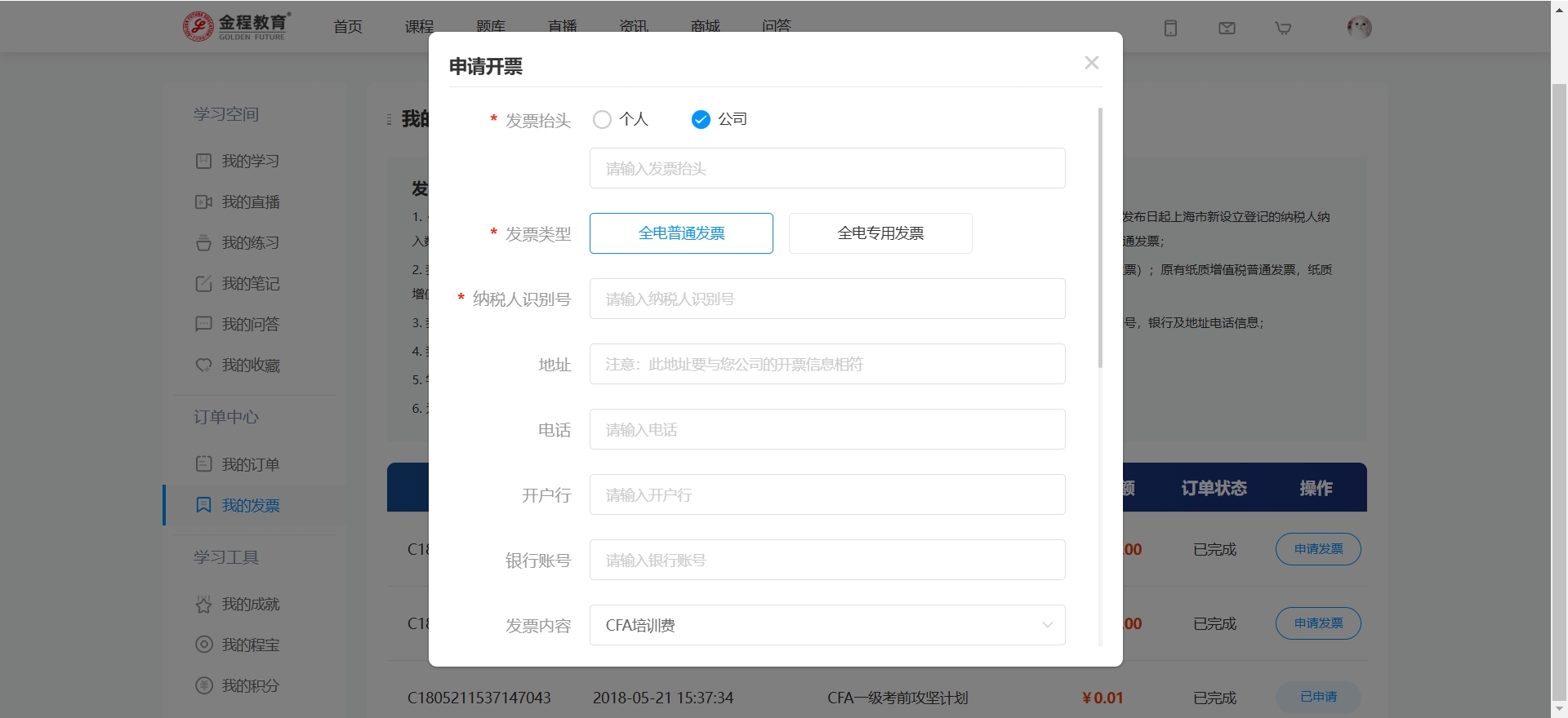 購買完課程,可申請開具發(fā)票,但必須填寫發(fā)票內(nèi)容。