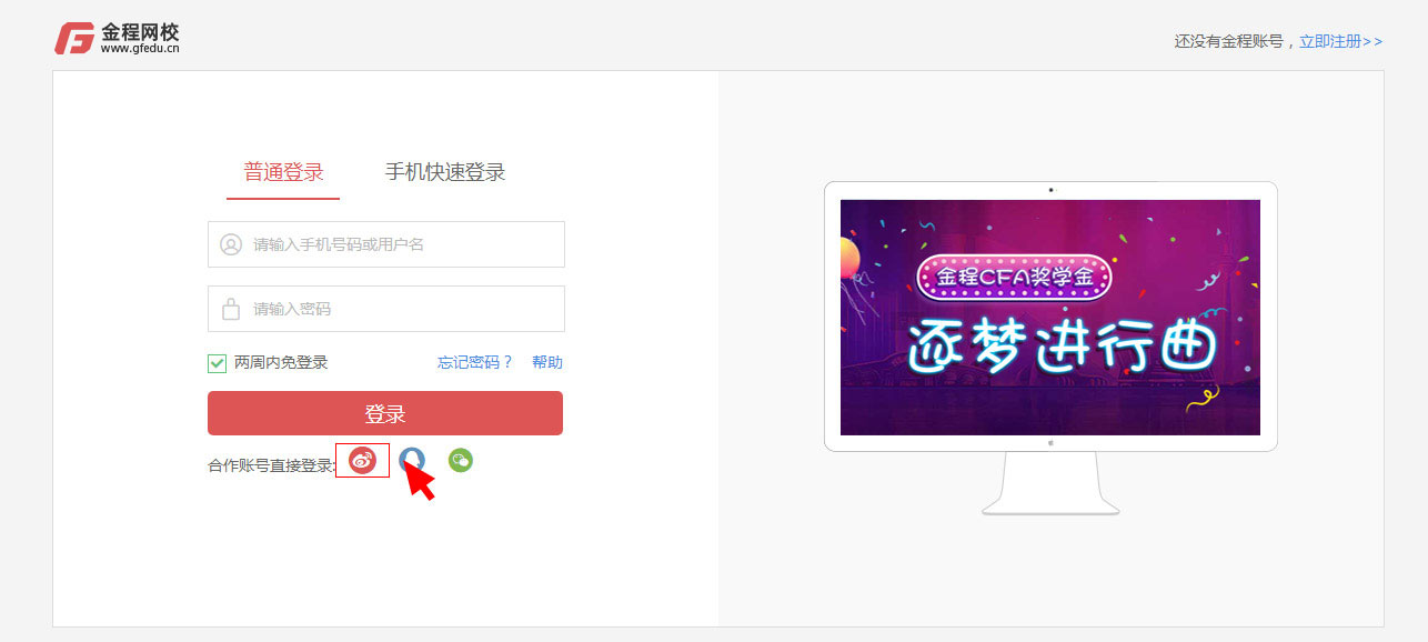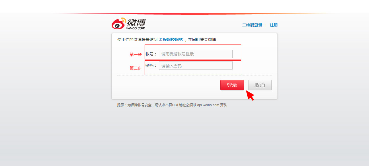 進入新浪第三方登錄頁面,第一步:輸入新浪賬號,第二步輸入新浪賬號密碼,點擊登錄,即成功登錄金程網(wǎng)校。