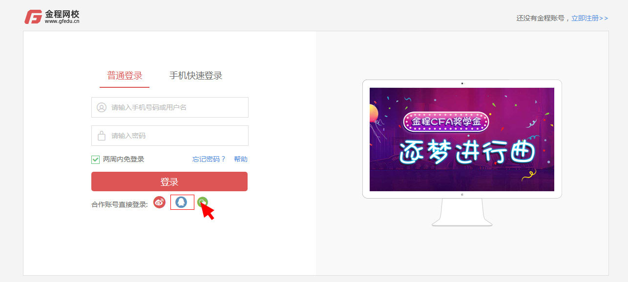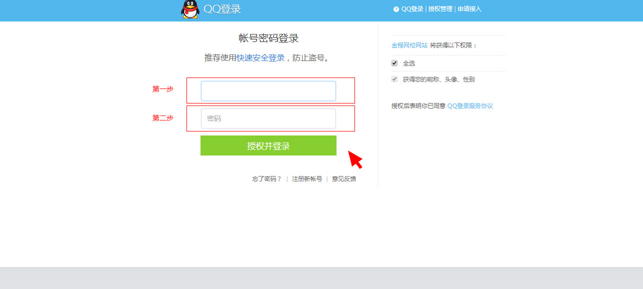 進入QQ第三方登錄頁面,第一步:輸入QQ賬號,第二步輸入QQ賬號密碼,點擊授權(quán)并登錄,即成功登錄金程網(wǎng)校。