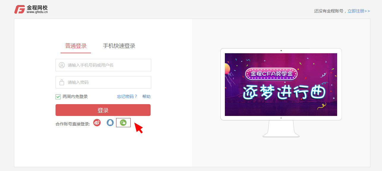 瀏覽器地址欄中輸入:金程網(wǎng)校網(wǎng)址 www.h8045.cn,點擊右上角“登錄”,進入金程網(wǎng)校登錄頁面。