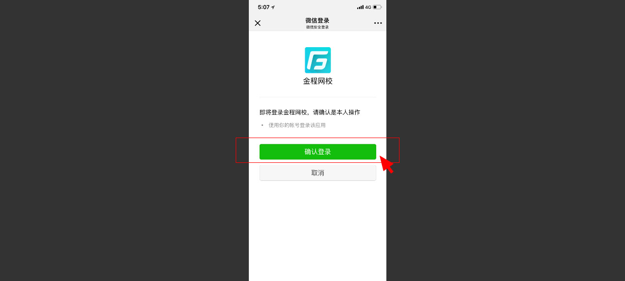 手機掃描成功后,點擊“確認(rèn)登錄”,即成功登錄金程網(wǎng)校。