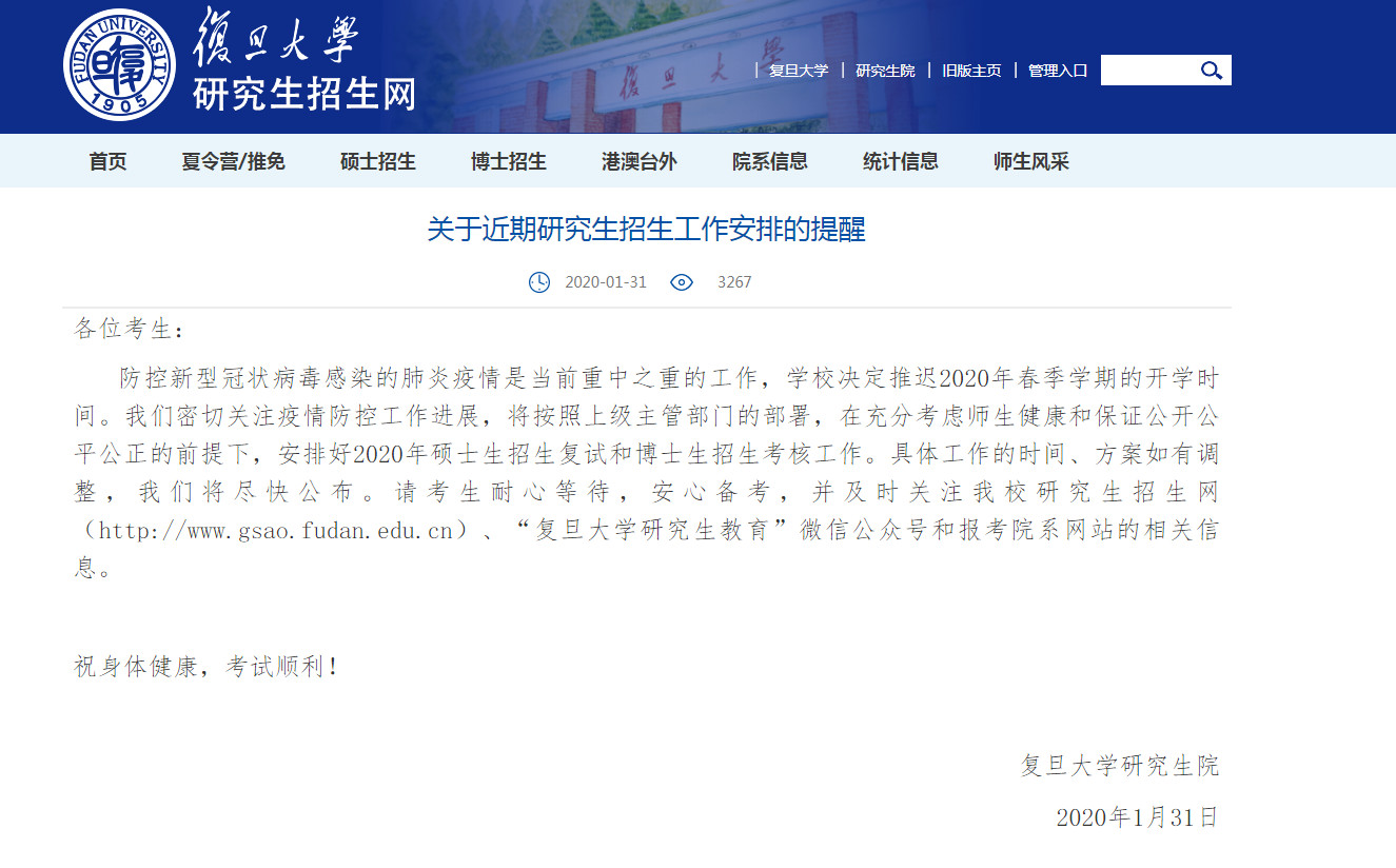 近日,復(fù)旦大學(xué)研究生官網(wǎng)發(fā)布復(fù)旦大學(xué)關(guān)于近期研究生招生工作安排的提醒,廣大報(bào)考復(fù)旦大學(xué)2020考研考生大家要做好復(fù)試準(zhǔn)備,大家持續(xù)關(guān)注金程考研,會第一時間為大家?guī)韽?fù)旦大學(xué)2020考研復(fù)試最新信息!