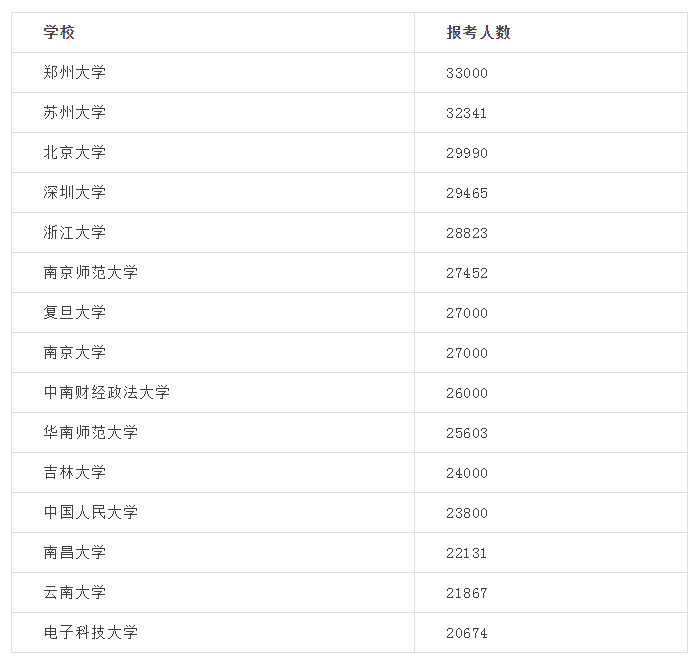 還有天津大學也有近20000人報考,此外還有一些熱門院校沒有公布2020考研的報考數(shù)據(jù),比如四川大學、山東大學、廈門大學等,去年四川大學報考人數(shù)達到了4.2萬!