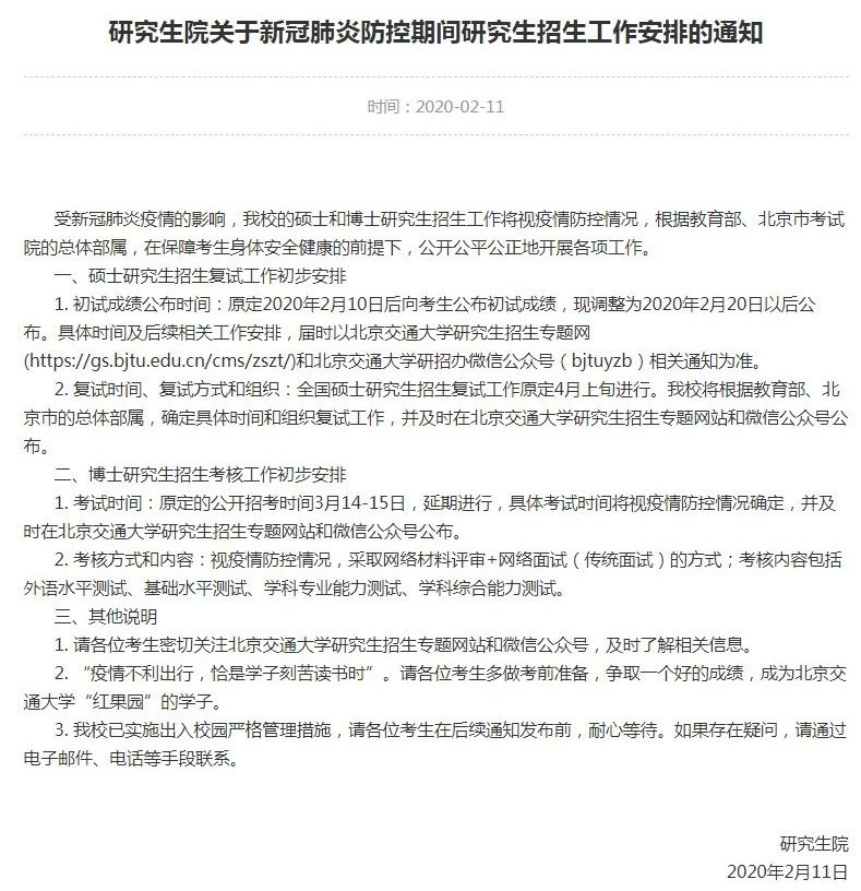 前天,北京交通大學發(fā)布了《研究生院關于新冠肺炎防控期間研究生招生工作安排的通知》。