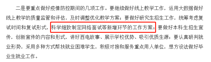 這樣看來(lái),西電的研究生復(fù)試很大可能會(huì)采用網(wǎng)絡(luò)面試。隨著疫情防控的進(jìn)展,不同的地域恢復(fù)情況也不相同,學(xué)校不太可能針對(duì)不同的地區(qū)的考生采取不同的標(biāo)準(zhǔn)&初試成績(jī)權(quán)重,所以四月恢復(fù)傳統(tǒng)面試的幾率仍然不高。