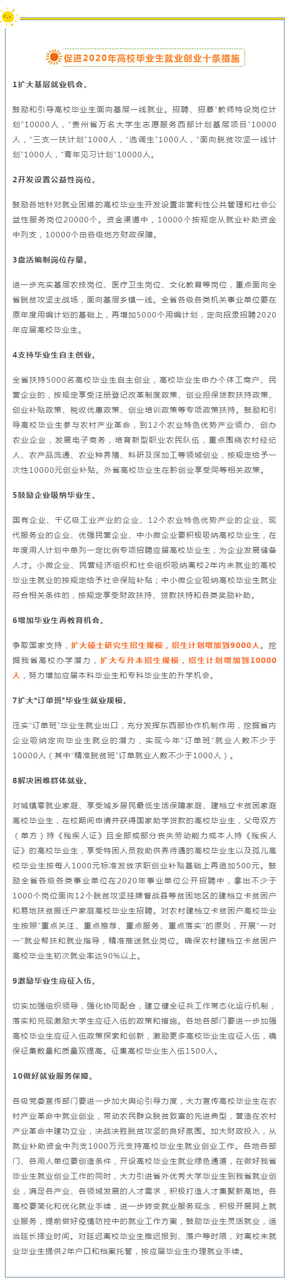 3月17日,貴州省教育廳印發(fā)《促進2020年高校畢業(yè)生就業(yè)創(chuàng)業(yè)十條措施》,其中提到擴大碩士研究生招生規(guī)模,招生計劃增加到9000人。