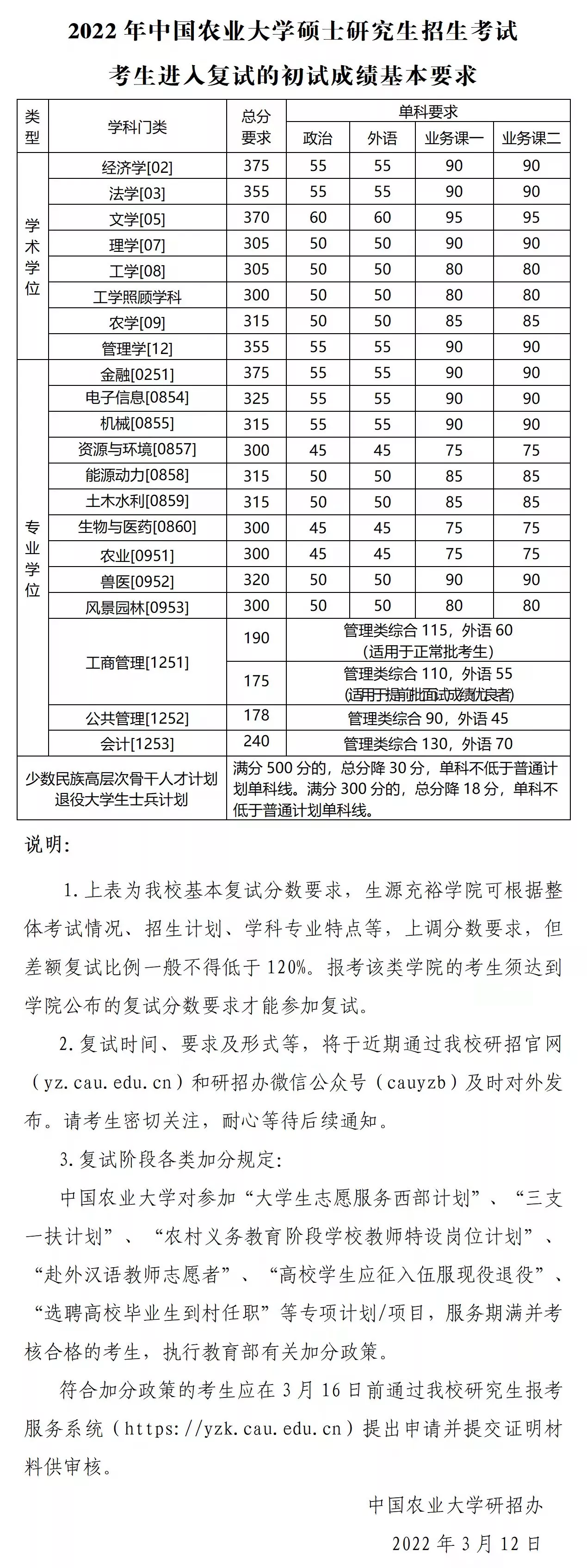 中國農(nóng)業(yè)大學2022年碩士研究生復試分數(shù)線