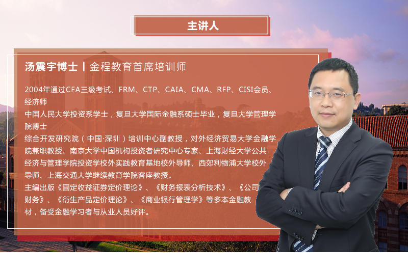 金程教育品牌創(chuàng)始人、董事長(zhǎng)、首席培訓(xùn)師;復(fù)旦大學(xué)博士、FRM、CMA、RFP、CFA(2004-2018)等財(cái)經(jīng)證書(shū)持證人。