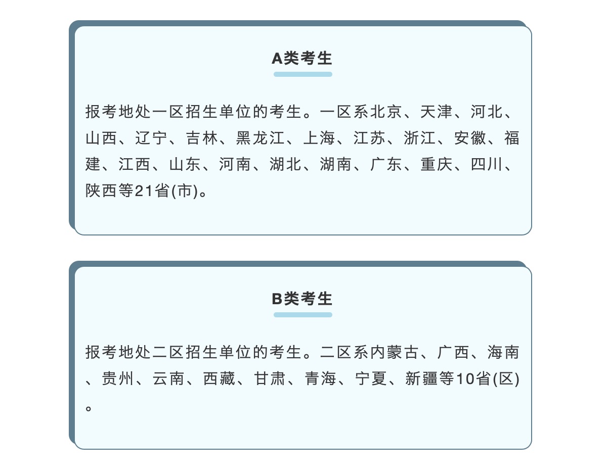 目前國(guó)家的教育發(fā)展還不均衡,為了相對(duì)公平,把全國(guó)31個(gè)省市自治區(qū)分為兩類(lèi),分別為一區(qū)和二區(qū)。當(dāng)然報(bào)考地處一區(qū)、二區(qū)招生單位的考生,分別為A類(lèi)考生和B類(lèi)考生。(如果報(bào)考A類(lèi)地區(qū)的考生總分或單科分?jǐn)?shù)沒(méi)過(guò),可以報(bào)考B類(lèi)地區(qū)的調(diào)劑。)