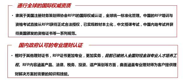 RFP (Registered Financial Planner),全稱美國(guó)注冊(cè)財(cái)務(wù)策劃師,為美國(guó)注冊(cè)財(cái)務(wù)策劃師學(xué)會(huì)所特許制定的通行全球的國(guó)際權(quán)威認(rèn)證資質(zhì)。自2005年引入中國(guó)大陸后,因系統(tǒng)實(shí)用的知識(shí)體系,受到政府、企業(yè)和學(xué)員的大力推廣和認(rèn)可。