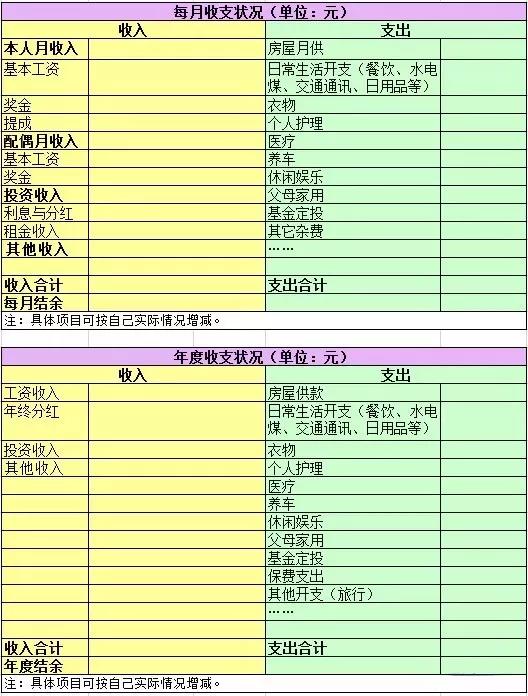 對于家庭收入這部分,自己和配偶的收入可以分開記錄,而支出項因為比較難分割,建議合并在一起記錄,可以按餐飲、日用品、交通、人情、醫(yī)療、投資支出等等大類來整理,至于具體類目就因人而異了。,用收入總和減去支出總和,就計算出結(jié)余了。以下的表格供大家參考。