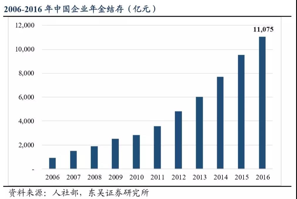 截至2016年末,中國(guó)企業(yè)年金基金累計(jì)結(jié)存1.1萬億元,占養(yǎng)老保險(xiǎn)體系資產(chǎn)總規(guī)模的比重約16%,而美國(guó)第二支柱占養(yǎng)老資產(chǎn)總規(guī)模的比重為61%,相比而言,中國(guó)的企業(yè)年金并未充分發(fā)揮第二支柱的作用。