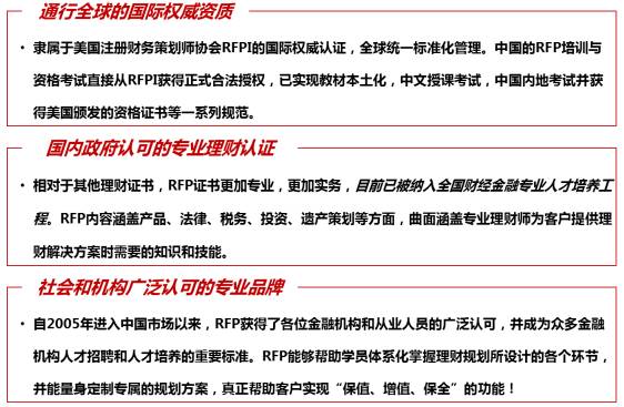 首先簡(jiǎn)單介紹下RFP,RFP全稱美國注冊(cè)財(cái)務(wù)策劃師,是通行全球的國際權(quán)威理財(cái)資質(zhì)。我報(bào)考的理由很簡(jiǎn)單,當(dāng)時(shí)的總監(jiān)建議我們一定要考一個(gè)證書,讓我們?cè)趲讉€(gè)里面選(RFP、ChFP、CFP),最終我選擇了RFP。當(dāng)時(shí)的考慮是,第一,要夠分量,選擇國際證書(ChFP從2018年開始由國家人社部認(rèn)證證書成為地方性行業(yè)協(xié)會(huì)認(rèn)證證書,含金量上會(huì)下降);第二,資金方面要合適,考CFP之前必須先考國內(nèi)的AFP,但是AFP是國內(nèi)一個(gè)協(xié)會(huì)認(rèn)證且價(jià)格昂貴,考完C要差不多2.5萬大洋,所以直接就選擇了含金量和性價(jià)比都比較高的RFP(當(dāng)然,考過其他證書的也都是非常棒的,這里只是就我個(gè)人而言)?,F(xiàn)在想想這也是非常正確的選擇,考證的目的不只是為了系統(tǒng)學(xué)習(xí)并掌握技能,借用專業(yè)資質(zhì)提升專業(yè)形象,更重要的是在學(xué)習(xí)過程中與工作結(jié)合,學(xué)習(xí)完后能夠不斷提供繼續(xù)教育和平臺(tái)不斷提升,而這些RFP都做到了。作為6.8萬持證人中的一員,言歸正傳,還是要談一下RFP,下面借用一張金程的圖,直接列明了RFP的資質(zhì)和含金量。