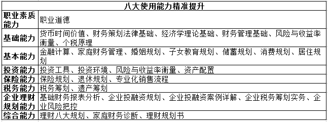 RFP是提供幫助個(gè)人/家庭實(shí)現(xiàn)理財(cái)目標(biāo)的解決方案的,而客戶的理財(cái)方案大類來分無非是:資產(chǎn)增值、子女教育、退休養(yǎng)老、保險(xiǎn)規(guī)劃、資產(chǎn)傳承、資產(chǎn)保全、稅務(wù)籌劃等內(nèi)容,而RFP的課程設(shè)置完全以此為基礎(chǔ)。