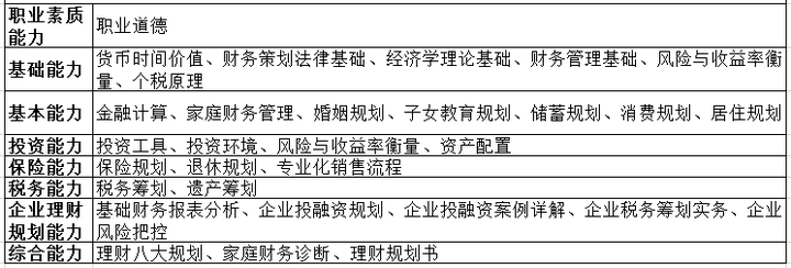 財(cái)務(wù)策劃原理、投資策劃、保險(xiǎn)及退休策劃、稅務(wù)及財(cái)產(chǎn)籌劃、子女教育及住房規(guī)劃、法律智慧、企業(yè)理財(cái)規(guī)劃。