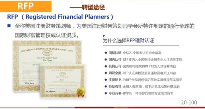 RFP (Registered Financial Planner),全稱美國注冊財務策劃師,為美國注冊財務策劃師協(xié)會所特許制定的通行全球的國際專業(yè)認證資質(zhì)。截止2016年年底,全球持證人超過6.8萬,中國大陸持證人數(shù)超過3萬人,會員分布在保險、銀行、券商、信托、基金、財富管理等金融機構(gòu)。