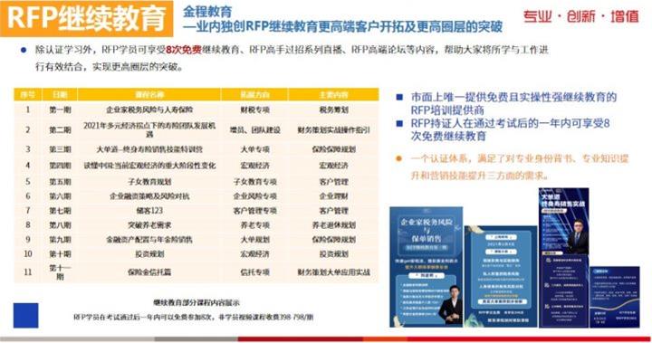RFP學員可享受8次免費繼續(xù)教育、RFP高手過招系列直播、RFP高端論壇等內(nèi)容,幫助大家將所學與工作進行有效結(jié)合,實現(xiàn)更高圈層的突破。 >>>點擊咨詢RFP考試報名條件