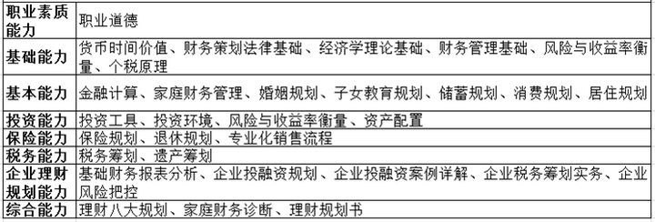 財務(wù)策劃原理、投資策劃、保險及退休策劃、稅務(wù)及財產(chǎn)籌劃、子女教育及住房規(guī)劃、法律智慧、企業(yè)理財規(guī)劃