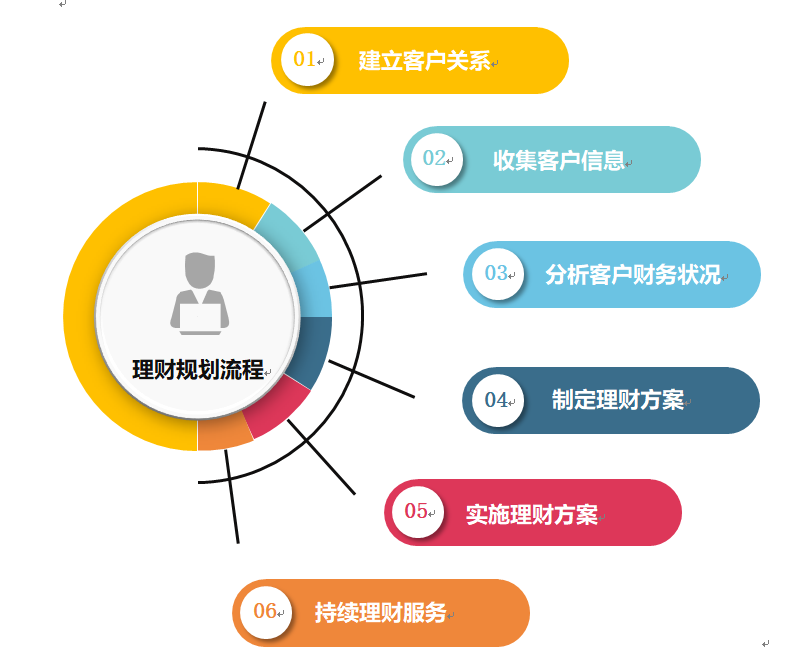 在具體的理財規(guī)劃執(zhí)行過程中,其標(biāo)準(zhǔn)流程可分為六步:建立客戶關(guān)系、收集客戶信息、分析客戶財務(wù)狀況、制定理財方案、實施理財方案和持續(xù)理財服務(wù)。