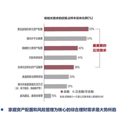 高凈值人群綜合多元資產(chǎn)配置意識更強,家庭子女教育及代際傳承安排需求的迫切性和重要性凸顯。高凈值人群家庭需求中,全球家族資產(chǎn)綜合配置、平衡投資、資產(chǎn)保障,境內(nèi)外子女教育,境內(nèi)外資產(chǎn)保值和增值,代際傳承安排,全球化、定制化的產(chǎn)品服務占據(jù)前5名。
