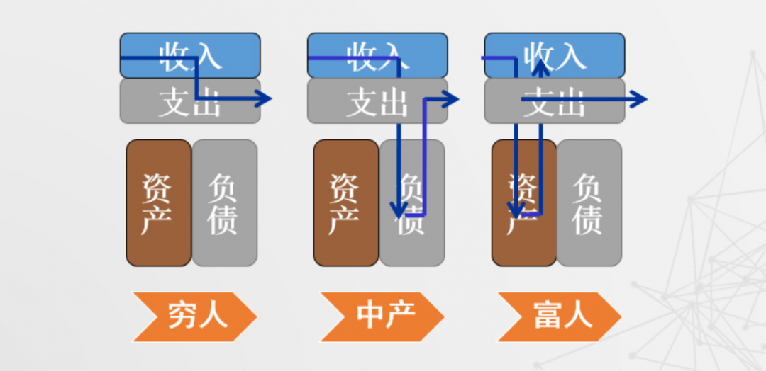 在客戶貧窮的時(shí)候,所有的收入都花出去。后來人們變得越來越有錢,開始逐漸進(jìn)入中產(chǎn)階級。這時(shí)中產(chǎn)階級開始進(jìn)行借貸消費(fèi),他們變成房奴、卡奴,永遠(yuǎn)成不了富翁。