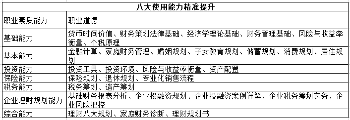 財(cái)務(wù)策劃原理、投資策劃、保險(xiǎn)及退休策劃、稅務(wù)及財(cái)產(chǎn)籌劃、子女教育及住房規(guī)劃、法律智慧、企業(yè)理財(cái)規(guī)劃。