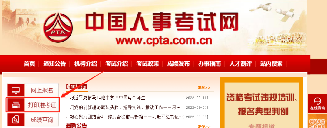 準考證打印官網(wǎng):中國人事考試網(wǎng)http://www.cpta.com.cn/index.html
