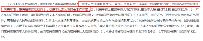 報(bào)名條件審核時(shí),中級(jí)報(bào)考人員所需提供材料之一:會(huì)計(jì)人員繼續(xù)教育情況,需提供從事財(cái)務(wù)工作年限的繼續(xù)教育記錄(根據(jù)規(guī)定學(xué)歷報(bào)考條件所需年限,提供相應(yīng)的繼續(xù)教育),以便于認(rèn)定從事財(cái)會(huì)工作年限。