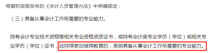 會(huì)計(jì)從業(yè)考試取消后,會(huì)計(jì)繼續(xù)教育不再跟證書(shū)掛鉤,而是跟人掛鉤,明確規(guī)定只要從事會(huì)計(jì)工作就必須參加繼續(xù)教育。