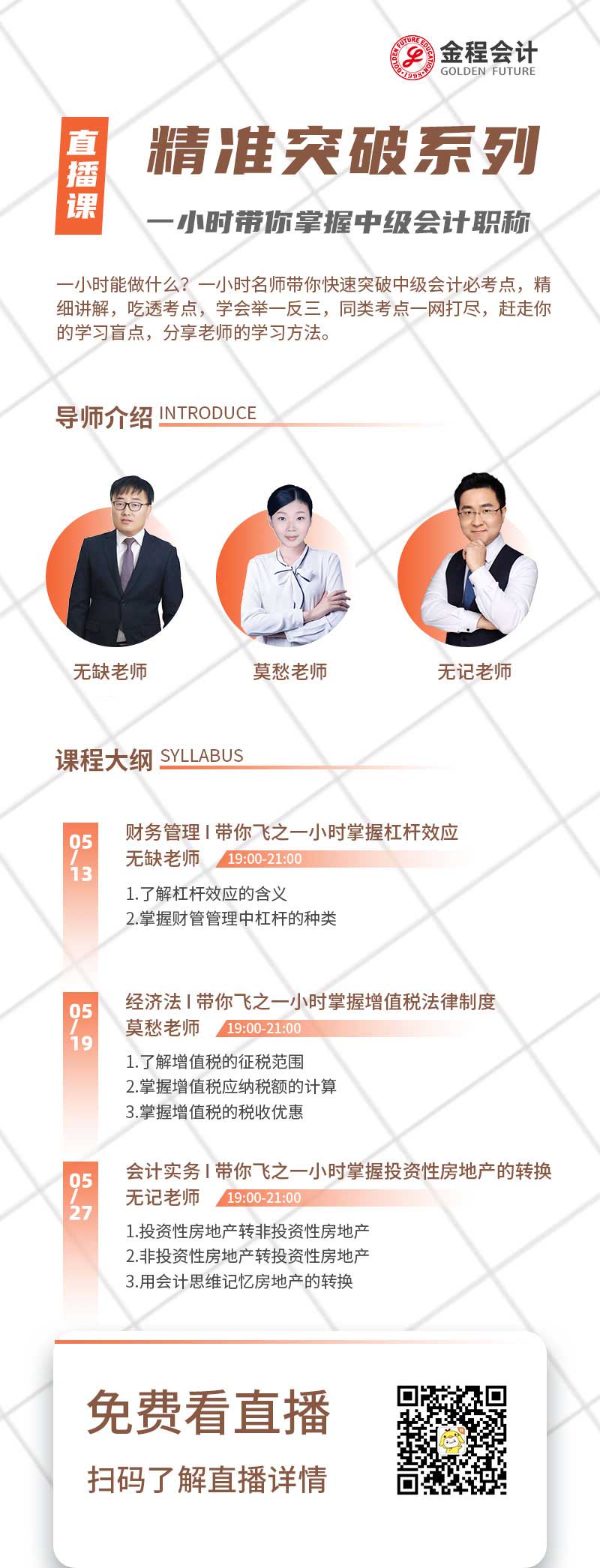 大家在備考的路上很艱苦,相信努力以后的結(jié)果不會讓大家失望。但請記住!堅持下去!5月27日晚7點,中級會計實務(wù)直播課精準突破系列,無記老師帶你飛之一小時掌握投資性房地產(chǎn)的轉(zhuǎn)換。名師帶你快速突破中級會計必考點,精細講解,吃透考點,學(xué)會舉一反三,同類考點一網(wǎng)打盡,趕走你的知識盲點,分享老師的學(xué)習(xí)方法。
