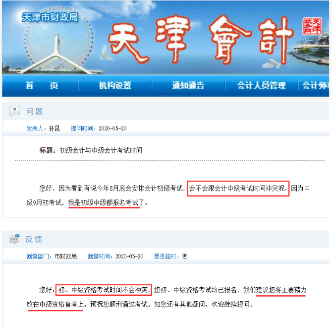 天津市財政局答復(fù)考生提問:初級、中級考試不會沖突!