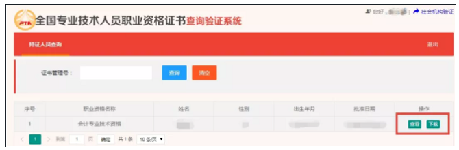 同意服務(wù)須知后,進(jìn)入持證人員查詢頁面,根據(jù)注冊信息,查詢已開通證書,點(diǎn)擊右下角“查看”或“下載”。