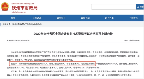剛剛,廣西欽州市財政局2020年度全國會計專業(yè)技術(shù)資格考試的通過率情況。