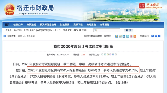 2020年度宿遷考區(qū)共有9511人報名初級會計職稱考試,參考人員通過率為41.7%,較上年提高18.9個百分點;
