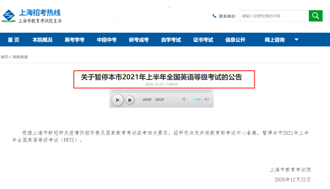 據(jù)@上海教育 微博24日消息,上海市教育考試院發(fā)布公告,根據(jù)上海市新冠肺炎疫情防控形勢及國家教育考試組考相關(guān)要求,經(jīng)研究決定并報(bào)教育部考試中心備案,暫停上海市2021年上半年全國英語等級(jí)考試(PETS)。