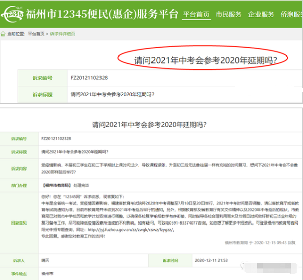 福州市教育局回復(fù):中考是全省統(tǒng)一考試,受疫情因素影響,福建省教育考試院將2020年中考調(diào)整至7月18日至20日舉行,2021年中考時(shí)間是否調(diào)整,請以省教育廳或省教育考試院通知為準(zhǔn),目前市教育局并未收到2021年中考延后舉行的通知。